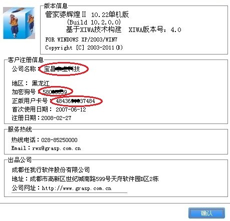 3. 获取版本信息中的“公司名称”,“加密狗号”,“正版用户卡号”等被验证信息。图片中圈红部分。